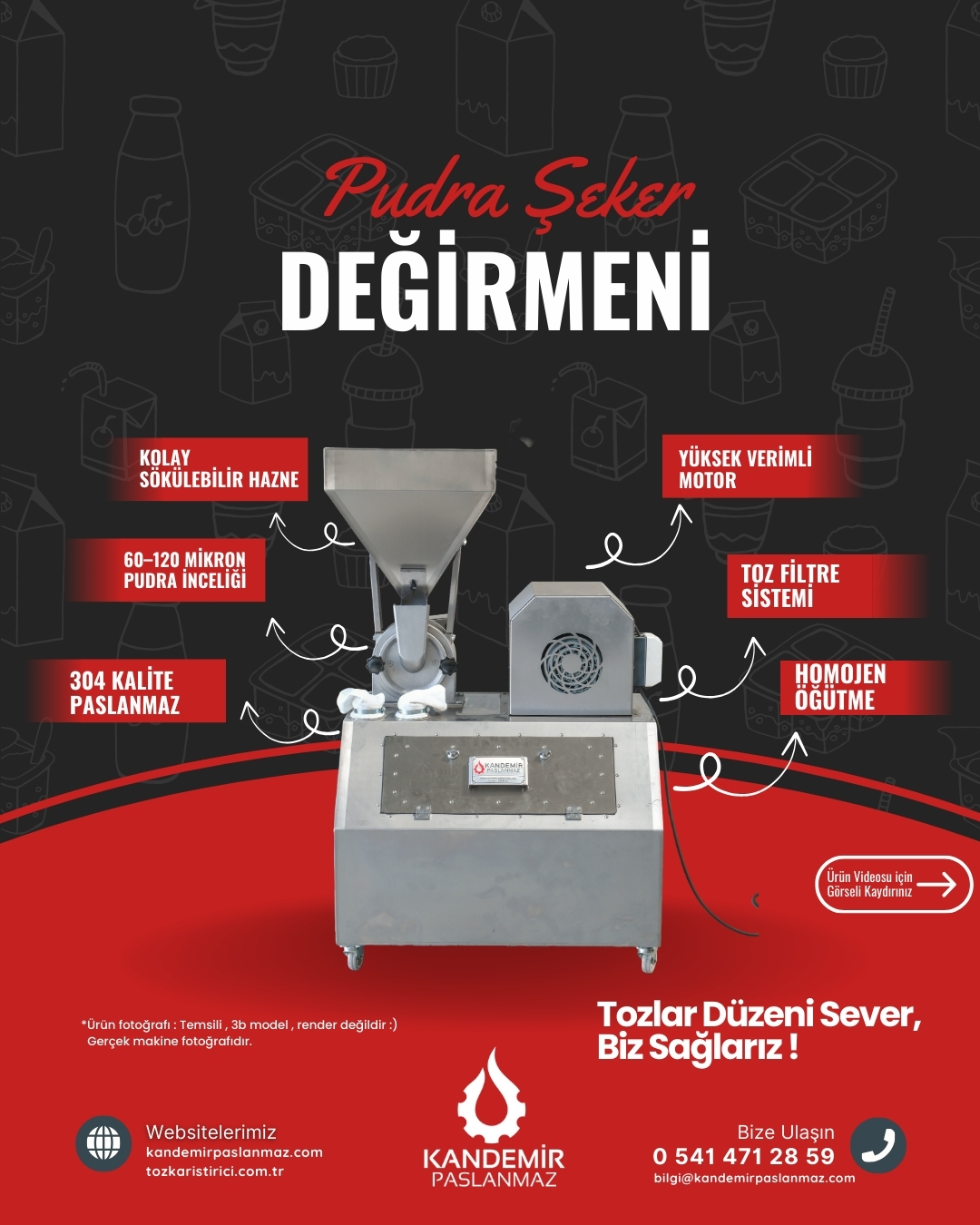 Pudra Şekeri Değirmenleri: Gıda sektöründe kullanılan bu makineler, şekerin ince toz haline getirilmesini sağlar.